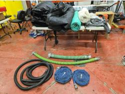 (3) 8 ft X 25 ft wind break tarps, (4) various size poly tarps, ice fishing rod, 30 inch X 72 inch poly folding table, qty of suction and discharge water hose