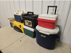brooms, shovels, clamps, axes, sledge hammer, rake, bolt cutter, long tape measure, fish tape, miscellaneous items