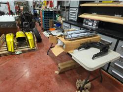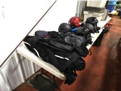 includes 30 inch X 72 inch poly folding table, (5) helmets and sizes (1)Black Bell XXXL, (1) No Name XXL, (1) Arai XXL, (1) Indian Motorcycle L, (1) Bell red M, (1) pair size 8.5 boots, (2) M/L jackets, (3) pair leather gloves, miscellaneous clothing items