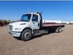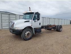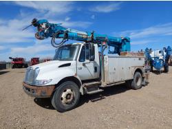 International DT466 7.6 L 6 cylinder diesel engine, automatic transmission, A/C, P/W, P/L, leather interior, air ride seats, stereo, 60 inch T x 40 inch W x 26 inch D steel tool boxes, 8 ft 4 inch x 12 ft deck, chain holders, PTO pump, Ferrari 708 3 section 24 ft knuckle crane, outriggers, air ride suspension, 14,000 lb rear axles, diff lock, 217 inch WB, all aluminum wheels, 275/70R22.5 front tires, 10R22.5 rear tires