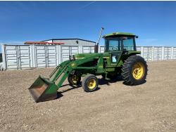 John Deere 158 loader, 84 inch bucket, John Deere 6.6 L 6 cylinder 111 HP, engine, 100 PTO HP, 16 speed Quad Range partial power shift transmission, cab, ROPS, rear differential lock, 540/1000 PTO, 2 rear hydraulic outlets, 245/75R16 front tires, 18.4-34 rear tires