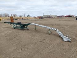 adjustable height, reversible 110V 1HP single phase Westinghouse motor, 15 inch W belt, includes (1) 10 ft extension w/ 14 inch rollers, (2) 34 inch L corner transitions w/ 14 inch rollers, and (2) tripods