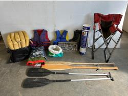 Inflatable boat, paddles, lawn chair, patio cushions, life jackets