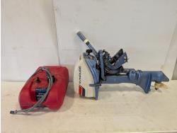 5215 1975 Evinrude Fisherman 6 HP Outboard Motor, 6 Gallon Fuel Tank and Fuel Line