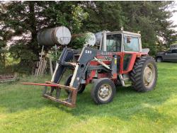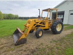 Allied 590 loader, bucket, grapple, bale forks, Perkins 5.2 L 4 cylinder 86 HP, engine, 12 speed partial power shift transmission, cab, rear differential lock, joystick, heat, 2 door entry cab, 540 PTO, 3 point hitch, 2 rear auxillary hydraulic outlets, 7.50-20 front tires, 18.4X38 rear tires