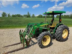John Deere loader, 88 inch bucket, John Deere 3.6 L 4 cylinder 66 HP, engine, 8 speed , Power Shuttle manual transmission, bolt in channel iron forks, open station platform, rear differential lock, joystick, new seat (not installed), 540 PTO, 3 point hitch, 11L-15 front tires, 18.4-26 rear tires, bolt in channel pallet forks