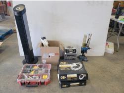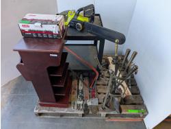 Fireplace set, manual post pounder, Ryobi 16 inch electric chain saw, metal table 22 inch x 22 inch x 26 inch h, magazine rack 15 inch x 13 inch x 30-1/2 h, Oregon chain breaker for chainsaws, chain saw bars, hand saw
