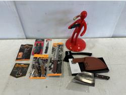 Mr. Heater tank top propane heater, thermometer, fire pokers, fishing rods