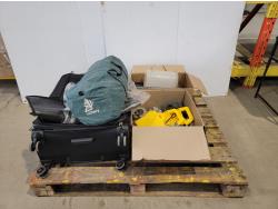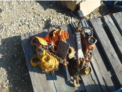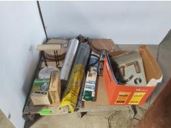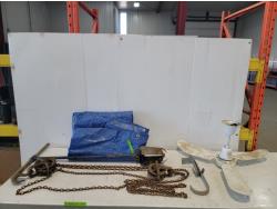 Ceiling fan, antique chain hoist, post hole auger, gate latch, tarp