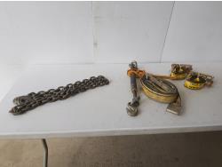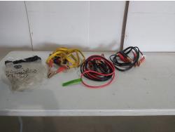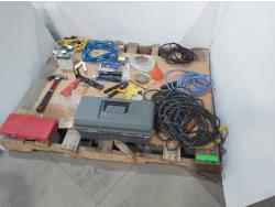Qty of booster cable clamps, medium rain suit, booster cables, 3/8 inch propane hose, 25 ft x 3/8 inch air hose, propane torch, Can-Lite ignition torch