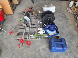 (6) Pipe Clamps, Qty of step in electric fence posts, buffer, (2) implement jacks, (3) 2 inch receiver hitches, unused 1500 watt invertor, miscellaneous