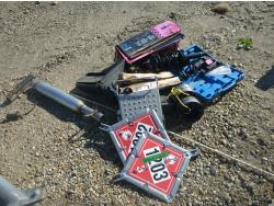 tarp, chainsaw case, fuel nozzle, weiner sticks