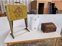 173 Vintage Bread Box, 5 Gallon Can & (3) TV Trays