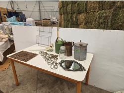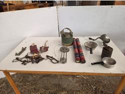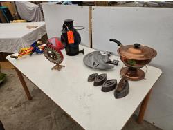 (4) Sad irons, copper pot with burner, clown figure, railway lantern, telephone & miscellaneous items
