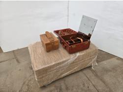105 24 Inch X 40 Inch Foot Stool, Vintage Whiskey Case & Wooden Shoe Shine Box