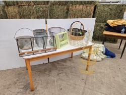 120 Wire Baskets, Pails, (2) Wicker Baskets, Wooden Tool Box
