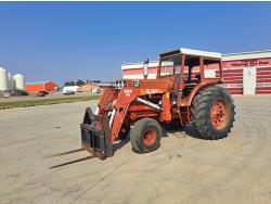 John Deere 640 loader, 84 inch bucket, grapple, grill guard, John Deere 4.5 L 4 cylinder 100 HP, diesel engine, 16 speed partial power shift transmission, cab, joystick, A/C, radio, air ride seat, 540/1000 PTO, 3 point hitch, 2 rear hydraulic outlets, 13.6-28 front tires, 18.4-38 rear tires