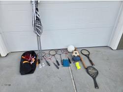 baseball bat, (2) soccer balls, (3) unused tennis balls, small football, tennis racket, (2) Babington birdies, pegs to set net up outside