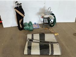 Golf clubs, outdoor mat 9 ft x 18 ft (3) tarps, folding side table, outdoor light clips, hose, hot dog roasting sticks