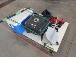 Coleman cooler, Master Chef tabletop BBQ, lawn sprinkler, camping folding chair and table, pizza paddle, (2) cell phone holders