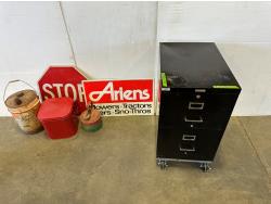 Two drawer wheeled filing cabinet 18 inch w x 27 inch d x 33 inch h, Ariens metal sign, vintage Esso sign