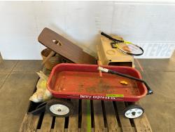 Wagon, pet carrier, cornhole game, softballs