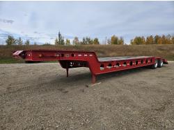 10 ft wide, 9 ft top deck, 26 ft main deck, with aluminum pull out extension to 15 ft, 13 ft rear deck, air ride suspension, wide load and rear strobe lights, removable aluminum ramps for rear deck loading, flip neck extension for tandem jeep, front mount Warn 20XL hydraulic winch, D ring tie downs, hydraulic neck stinger arm, all aluminum rims, 255/70R22.5 tires