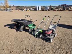7280 (2) Poly Wheel Barrows, Scott Broadcaster, (2) Lawn Mowers