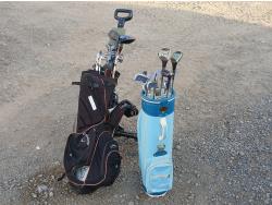 (1) Set men's left handed golf clubs, (1) Set women's right handed golf clubs, (1) two wheel pull cart.
