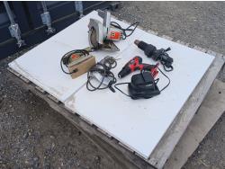 Sentinel heat gun, Black and Decker skill saw, Skil drill with 12V battery with charger, Black and Decker palm sander, drill (brand unknown).