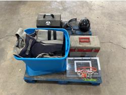 (4) life jackets, mini basketball net, tackle box with contents, Bear youth compound bow, Camp Chef grill