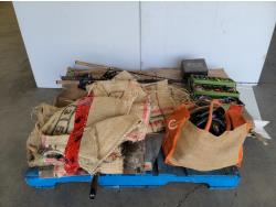 (4) fishing rods, tackle box with contents, plumbing parts, burlap, Maxx tub shower wall