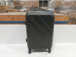 Textured ABS mould design, fully recessed aluminum pullout handle, removable toiletry divider with hanger (black), 1 flex divider, clothing travel straps, top and side ergonomic Gel grip handles, 4 wheel spinners, inset metal plate 2.25” W x 1.285” H, size 21” X 14” X 9 (Carry on size)