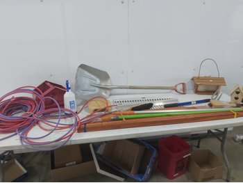 aluminum scoop shovel, (2) 2 ft aluminum landscape rake heads, (3) bird feeders, (6) wooden handles, (2) aluminum extendable handles, 1/4 inch rubber hose, wooden mallet