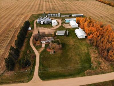 1800± sq ft home with single heated attached garage, fully developed basement, (4) bedrooms, (3) bathrooms, 34x64 heated shop (2) 10 Ft doors, air compressor, 34 x 50 heated shop (1) 14 Ft door, air compressor, & steam washer, 36 x 80 metal clad cold storage building, 12 Ft door (dirt floor), 40 x 80 metal clad cold storage building, (4) 14 Ft doors (gravel floor), 48 x 96 steel frame cold storage building (gravel floor) w/ attached 40 x 100 open faced machine shed (concrete floor), 26x100 open faced machine shed, MC 975 continuous grain dryer & grain handling system, natural gas, power, drilled water well, surface discharge septic system, 141.3± cult acres, barley 2021, canola 2020, remainder yard site, Rge Rd 10 road access