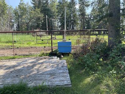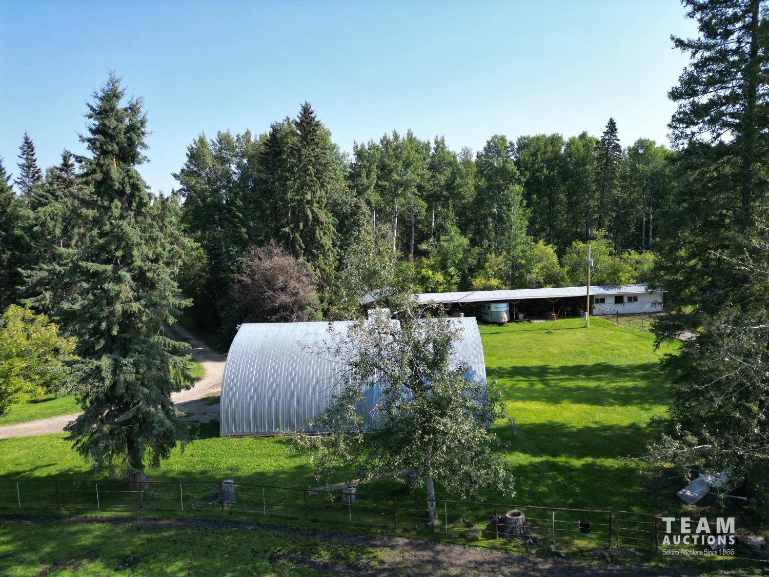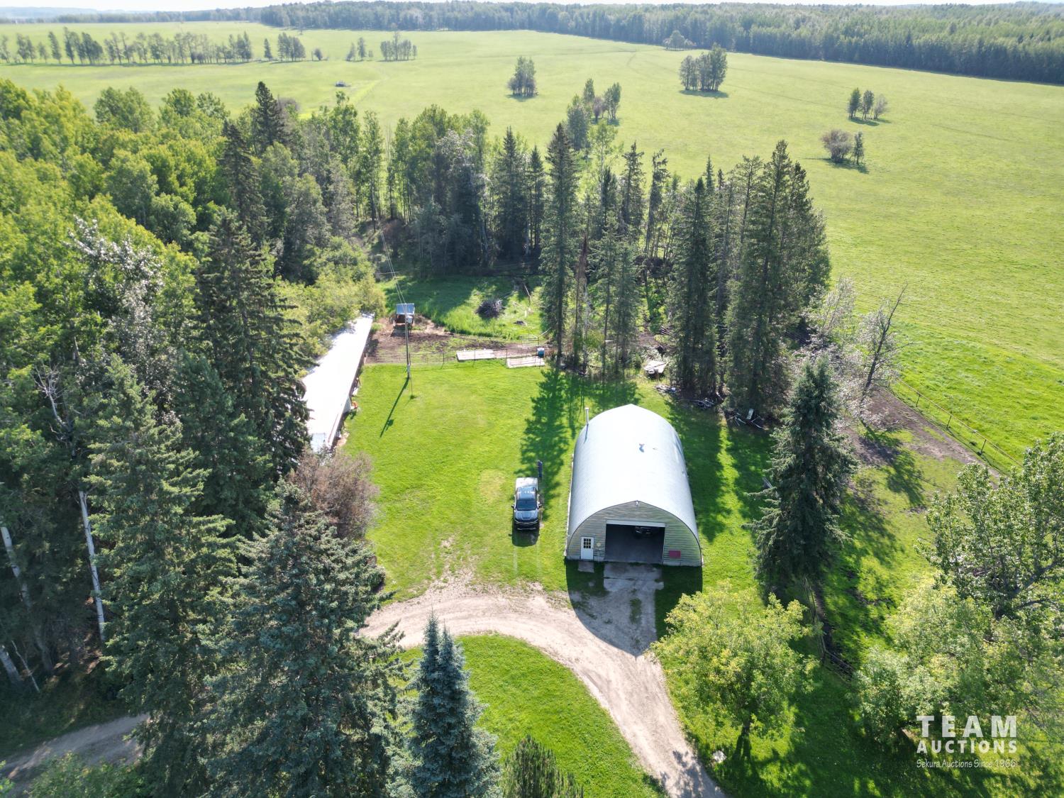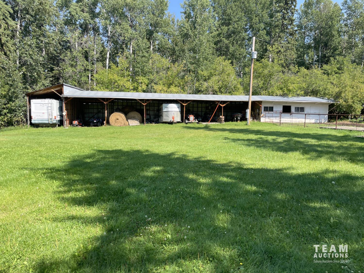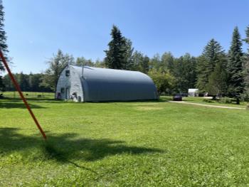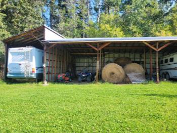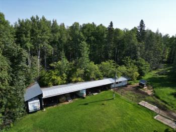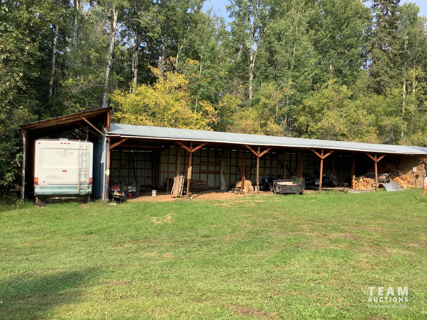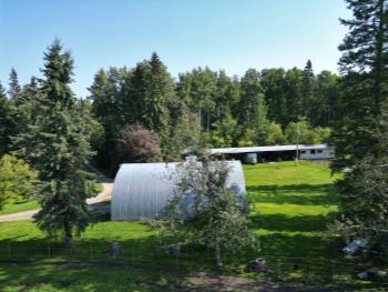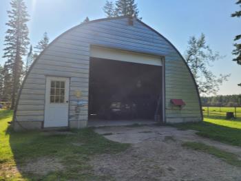 Gazebo/Firepit Amazing covered area overlooking the Pembina River Whirly bird on roof above firepit aids in clearing any smoke. Concrete floor in firepit portion Plank floor in river viewing area. 32 X 48 Ft Quonset Shop Heated, insulated Two-piece bath Small mezzanine Overhead door Open faced Five-bay Machinery Storage Taller RV storage bay on west end, Power Small Barn Tack area Double tie stall Single tie stall Large box stall with its own exit gate to paddock Floor drain for ease in cleaning Power Concrete floor Garden Shed Two room Character wood floor