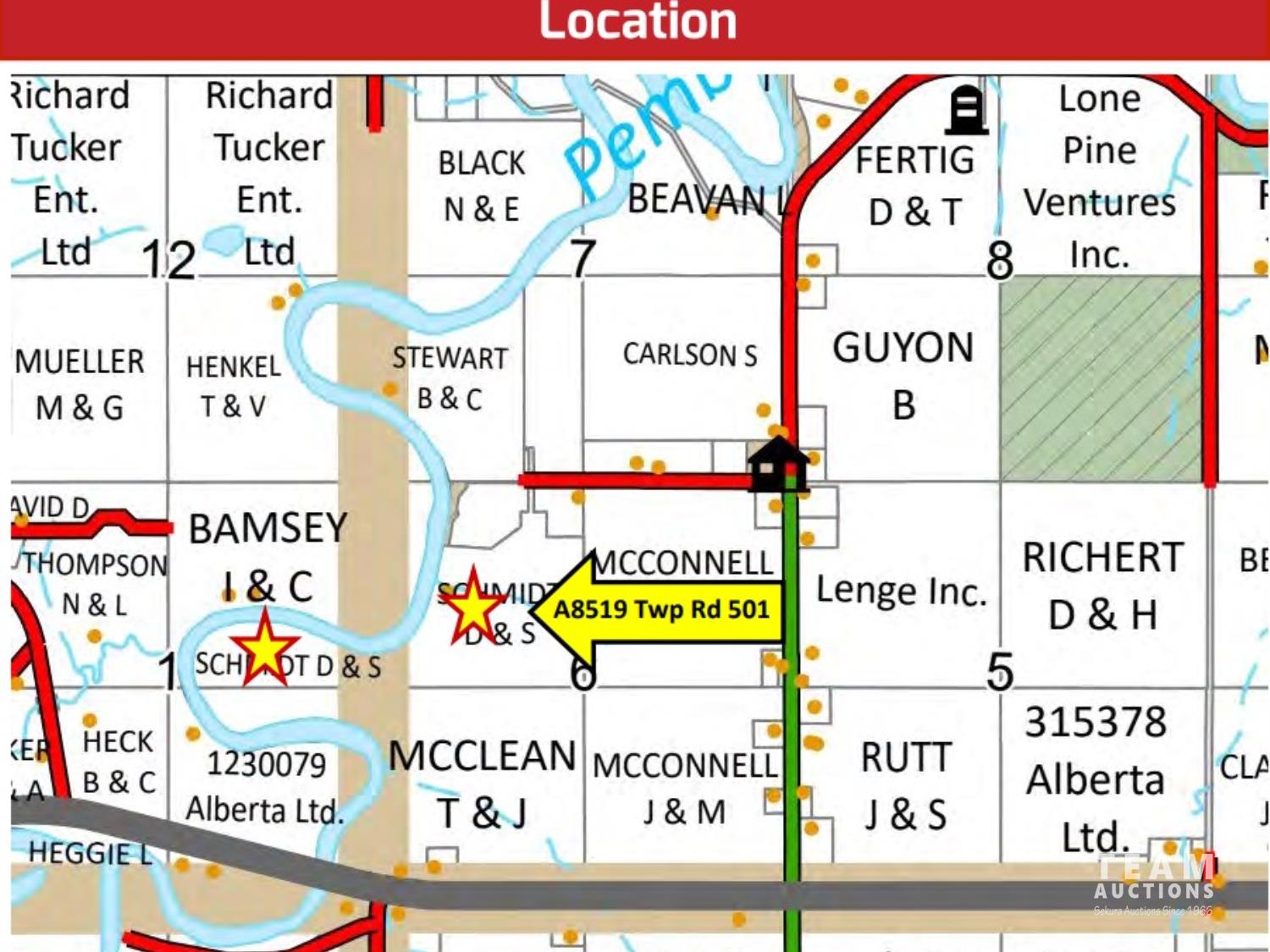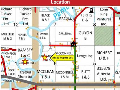 From Drayton Valley (50 Ave & Hwy 22 intersection) continue north 6.9 km on Hwy 22 to Hwy 621, turn left and continue west 11.4 km on Hwy 621 to RGE Rd 85, turn right and continue north 1.6 km to TWP Rd 501, turn left and continue west 1 km to driveway. Note Appointment with Trent (780-202-0140) required if wishing to enter property.