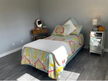 The house boasts vinyl tile/planking throughout most of the home. The main floor features a stylish kitchen with oak cabinetry, granite countertops, a raised breakfast bar, a bright dining nook, and a formal dining room, spacious entry, living room with cathedral ceiling, and there is also a front office/bedroom, a master bedroom with an ensuite (vanity with 2 sinks and walk in shower) and walk-in closet, a second bedroom, a laundry/sewing room, and both a 4-piece and a 2-piece bathroom, and garage access.