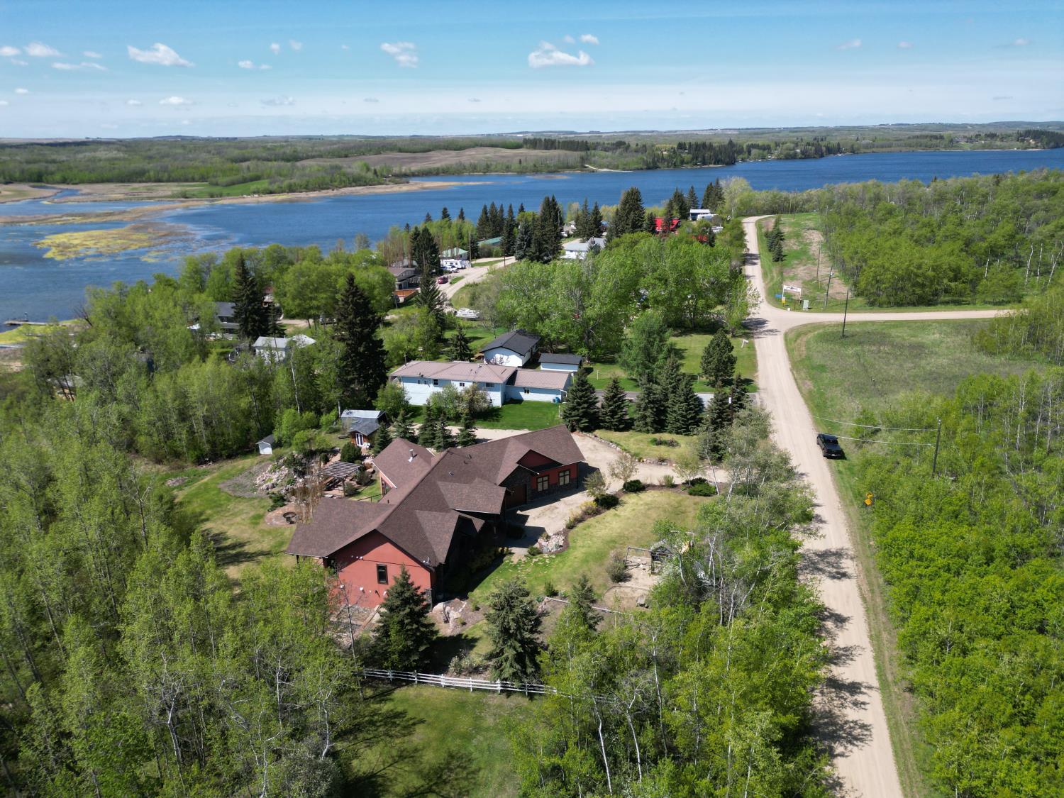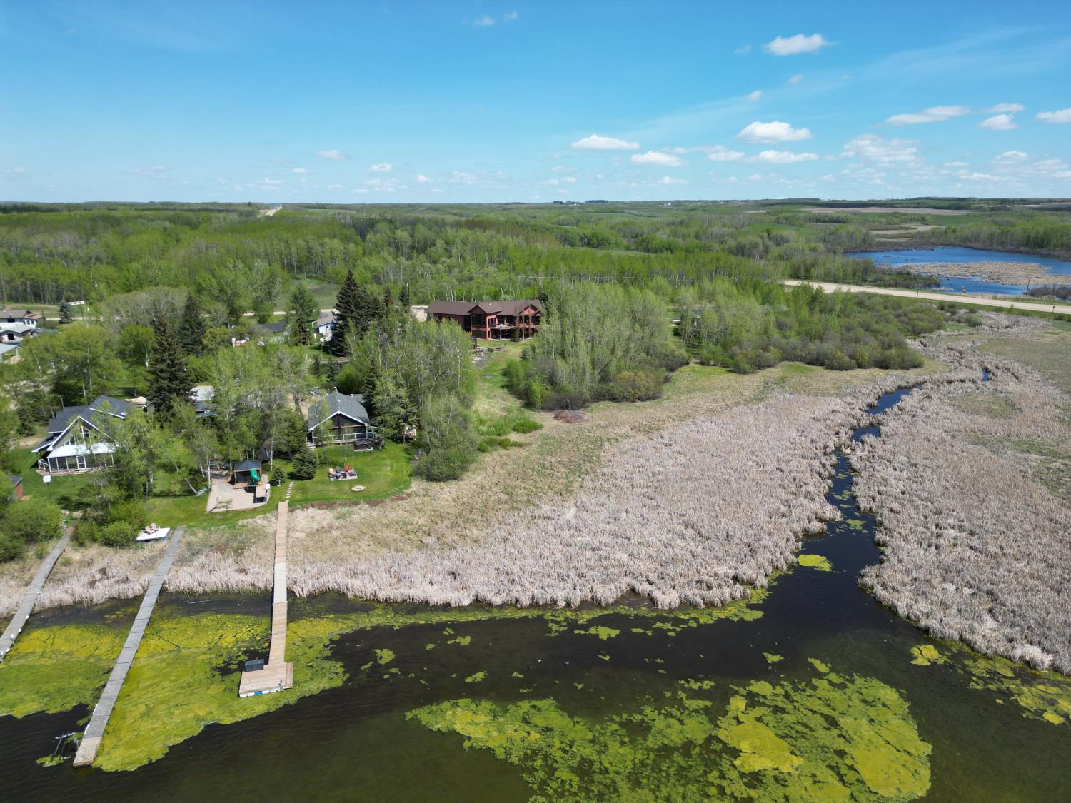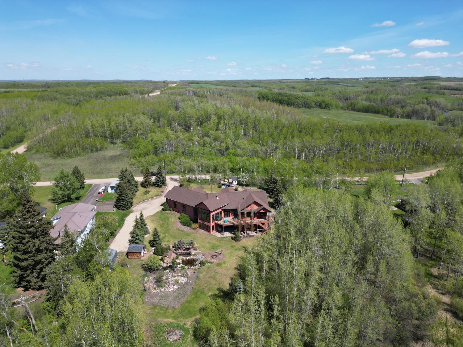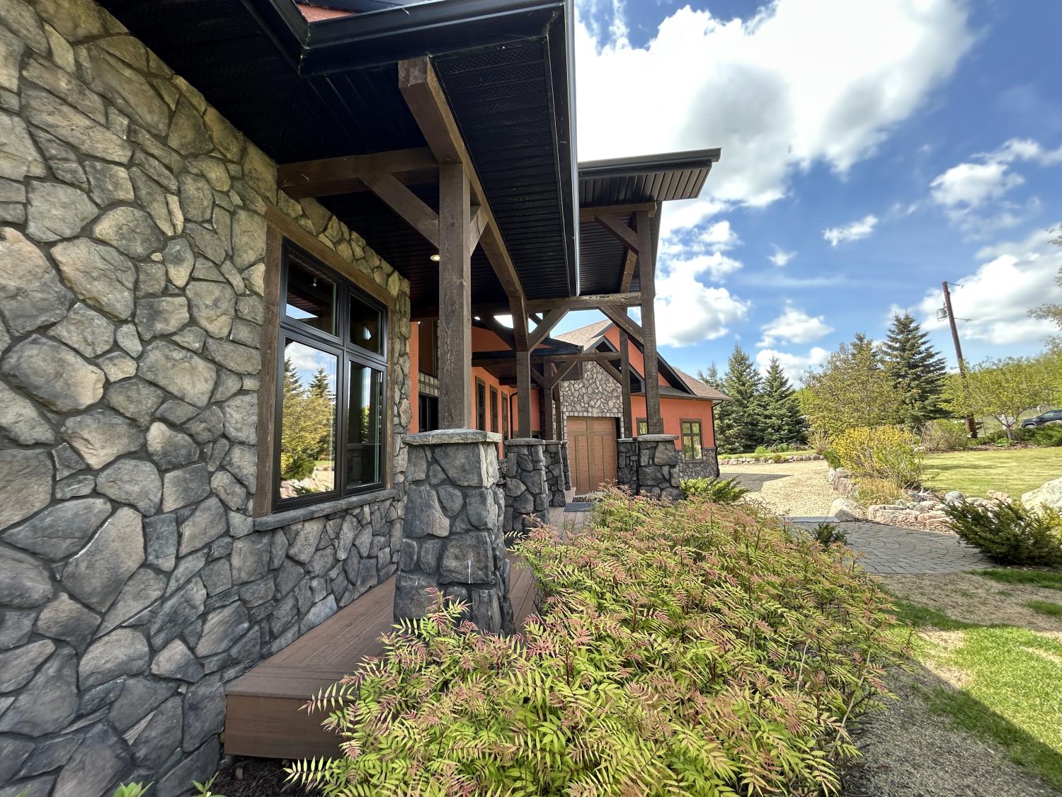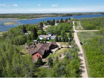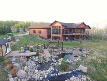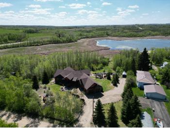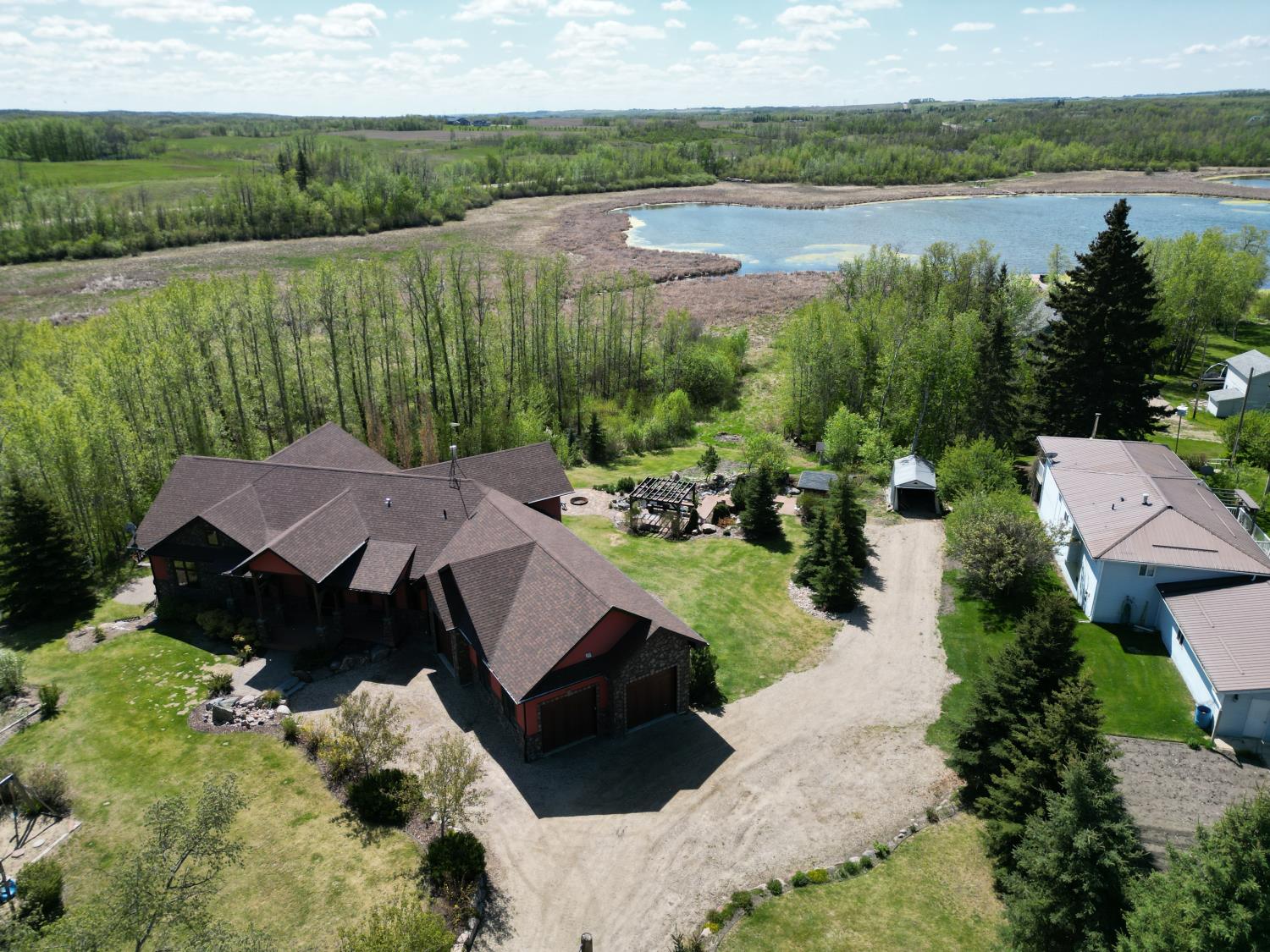 SELLING WAY BELOW APPRAISED VALUE ON FILE. ACREAGE-STYLE LAKE LIVING. Rare 2.00 +/- acre property with a stunning executive walk-out bungalow — 5 bedrooms, 3.5 bathrooms and luxury at every turn! Parklike landscaping, water features and a world-class resort vibe set the stage. Built with energy-efficient ICF block foundation and walls, this home features a chef’s kitchen with petrified wood and granite sinks, double-edged granite counters and custom distressed cabinetry. The living room showcases a sleek linear fireplace surrounded by custom granite, marble, and slate wildlife artistry. The dream primary suite offers a huge soaker tub, double sinks, a walk-in shower, and a massive closet. Soak in lake views from the sprawling 35x17 south-facing deck or kick back in the private screened-in Sun/BBQ room. The fully finished walk-out and self contained basement with separate entrance is loaded with features: 10’ ceilings, a full second kitchen & bar with leathered granite, additional laundry washer/dryer combo, a gym room with backyard views, two more bedrooms, two oversized rec rooms, in-floor heat, and a full bath. Triple pane windows, central Air & roughed in for Hot tub. Ample opportunity here to generate extra income and revenue in such a highly sought after recreational destination conveniently located between Calgary and Edmonton. Build your own lakefront dock and boat slip. Some local residents also use the county trail and municipal reserve area just a short walk down a nature trial to enjoy the lake and dock boats. A super cute guest casita is ideally located right next to the water feature and yoga platform. Tucked away on the quiet SE end of the lake where birdwatching, privacy and fishing are all top of list. Your dream home is waiting!