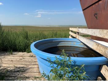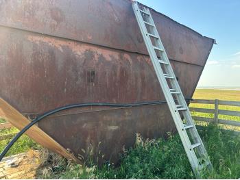 Custom built water holding tank at well site.