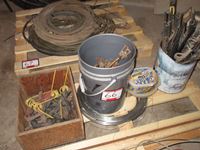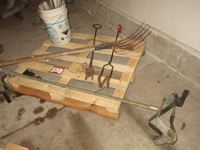 (2) Branding Irons N & R, (2) pitch forks, calf puller, pail of fence stays