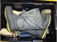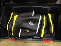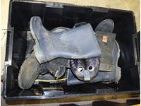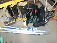various boots, camo hunting boots size 12, 1200 gram thinsulate, black rubber boots size 12, Black Diamond steel toe black rubber hip waders size 11, (3) pair Cebo black and yellow rubber boots size 11