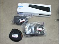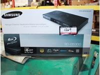(1) Samsung Blu-Ray disc player, (1) blue tote contains multiple DVD movies, (2) clear tote multiple DVD movies