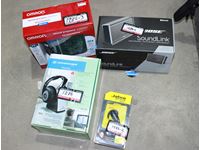 Icomm radios, Wilson electronics cell phone signal booster, Small green bucket with Brunton two-way radios and chargers