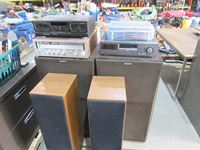 Sharp twin cam double cassette player w/ X-bass, black soft case w/ cassettes, (2) black soft cases w/ DVD's, (3) brief cases brown, dark brown & black w/ cassettes