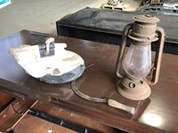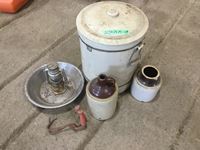 1628 Antique Moonshine Jugs, Lantern, #10 Ceramic Pail, & Hay Picks