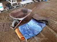 Wheel barrow, tarps, floor mat
