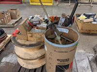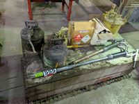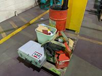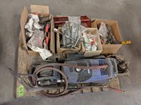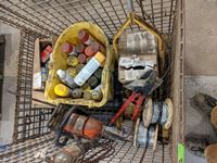 Anchor bolts, Hilti drill bits, Jack all, booster cables, slings, filters, (2) wooden spools, Stihl 55R trimmer for parts