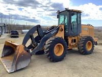 84 inch Q/A tooth bucket, 5 cylinder, turbo charged diesel engine, two speed, high flow hydraulics, hand controls, cab heat