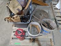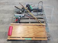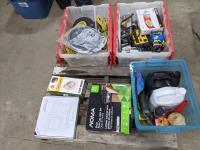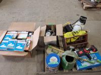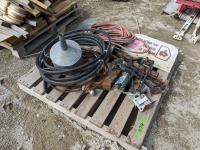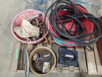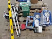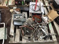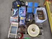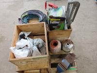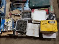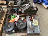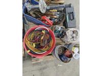 Miscellaneous hardware, hydraulic valves, bin of extension cords & hoses, ice fishing jigs, farriers kit, pallet of hoses